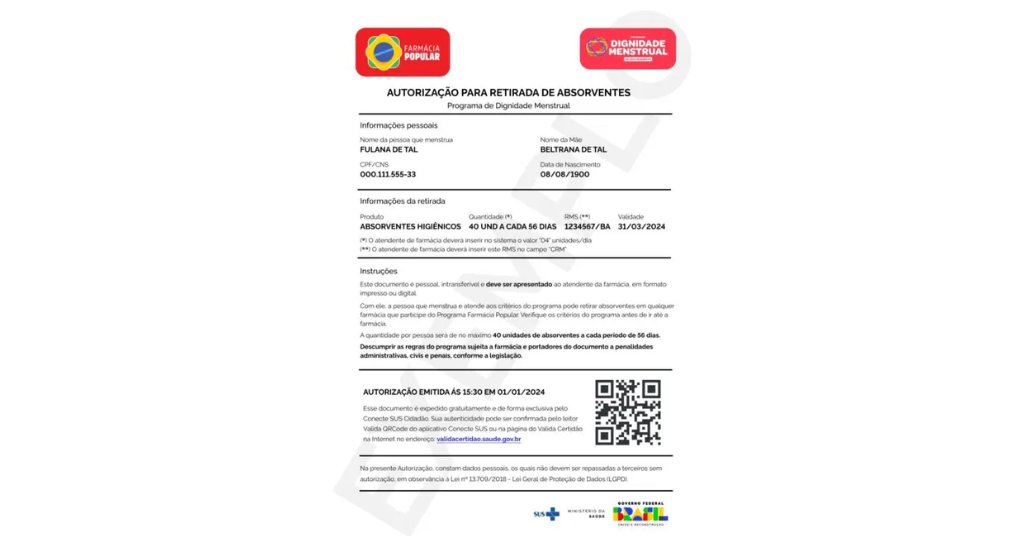 Para retirar os absorventes gratuitos do Programa Dignidade Menstrual, é necessário apresentar uma autorização oficial do programa.
